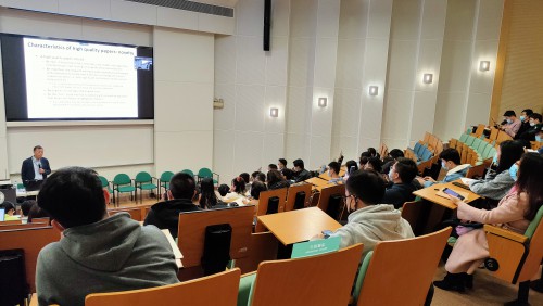 The lectures revolved around the writing methods of scientific research papers and graduation thesis. In the writing part of the scientific research paper, Professor Zhou will provide an overview of the characteristics of excellent articles, including originality, impact and creative conception, and provide examples of high-quality papers. In terms of graduation thesis writing, Professor Zhou will analyze the key contents that a typical doctoral thesis should contain and its corresponding structure and show examples of excellent doctoral thesis. Finally, in the Q&A session, the students present and online were very enthusiastic in asking questions, and Professor Zhou answered their questions one by one. Professor Zhou encourages students to read more and learn more from each other.