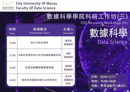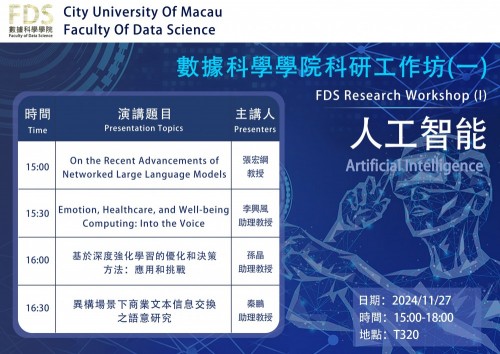 Three Research Workshops were successfully organised between November and December 2024 to enhance mutual understanding among the faculty members of the Faculty of Data Science. These workshops provided a platform for faculty academic staff to share their research interests and results, and facilitated cross-disciplinary exchanges and collaborations. Each workshop focused on a specific theme, namely ‘Artificial Intelligence’, ‘Information Security’ and ‘Data Science’. Through this series of activities, the Faculty aims to build a closer academic community, stimulate innovative thinking and promote in-depth discussions on cutting-edge areas.