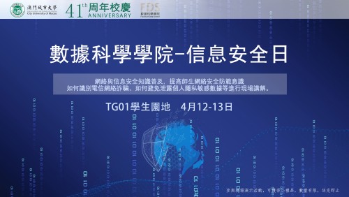 With the rapid development of Internet technology, network and information security issues have become increasingly prominent and have become major issues related to national political security, economic security, social security, cultural security and national defense security, and have received widespread attention. In order to popularize network and information security knowledge, the Faculty of Data Science of City University of Macau held a two-day "Information Security Day" from 12 to 13/04/2022 in the student garden of Taipa Campus yesterday to increase the awareness of network security prevention among teachers and students.